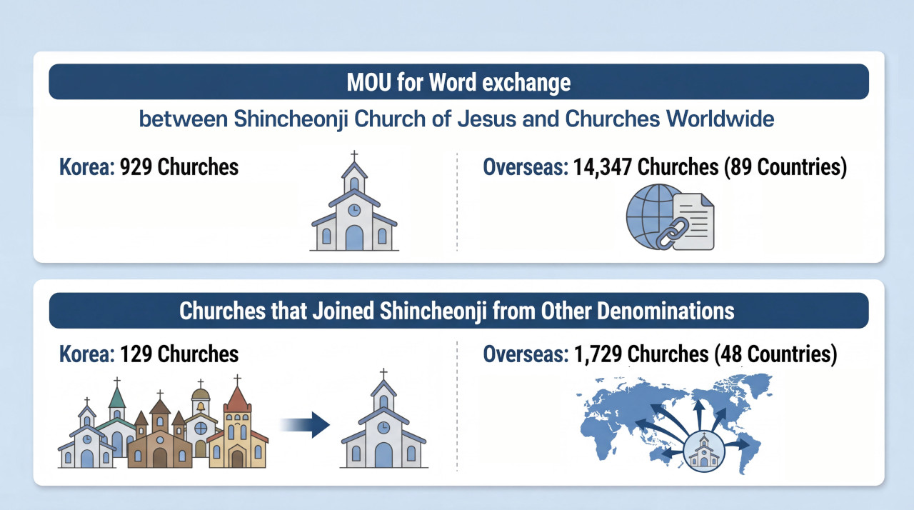 Nach mehr als vier Jahrzehnten ihres Bestehens weitet die Shincheonji-Kirche Jesu ihr Engagement in der Welt weiter aus. Die Kirche knüpft aktiv Beziehungen zu pastoralen Gemeinschaften im In- und Ausland, indem sie Absichtserklärungen (MOUs) zum Austausch des Wortes sowie Vereinbarungen (MOAs) zur Umbenennung von Kirchen unterzeichnet. Bis zum vergangenen Jahr wurden in Südkorea insgesamt 969 MOUs und in 89 weiteren Ländern 14.347 MOUs zum Austausch des Wortes abgeschlossen. Durch entsprechende MOAs haben sich in Südkorea 129 Kirchen und weltweit 1.729 Kirchen in 48 Ländern in „Shincheonji-Kirche Jesu“ umbenannt.